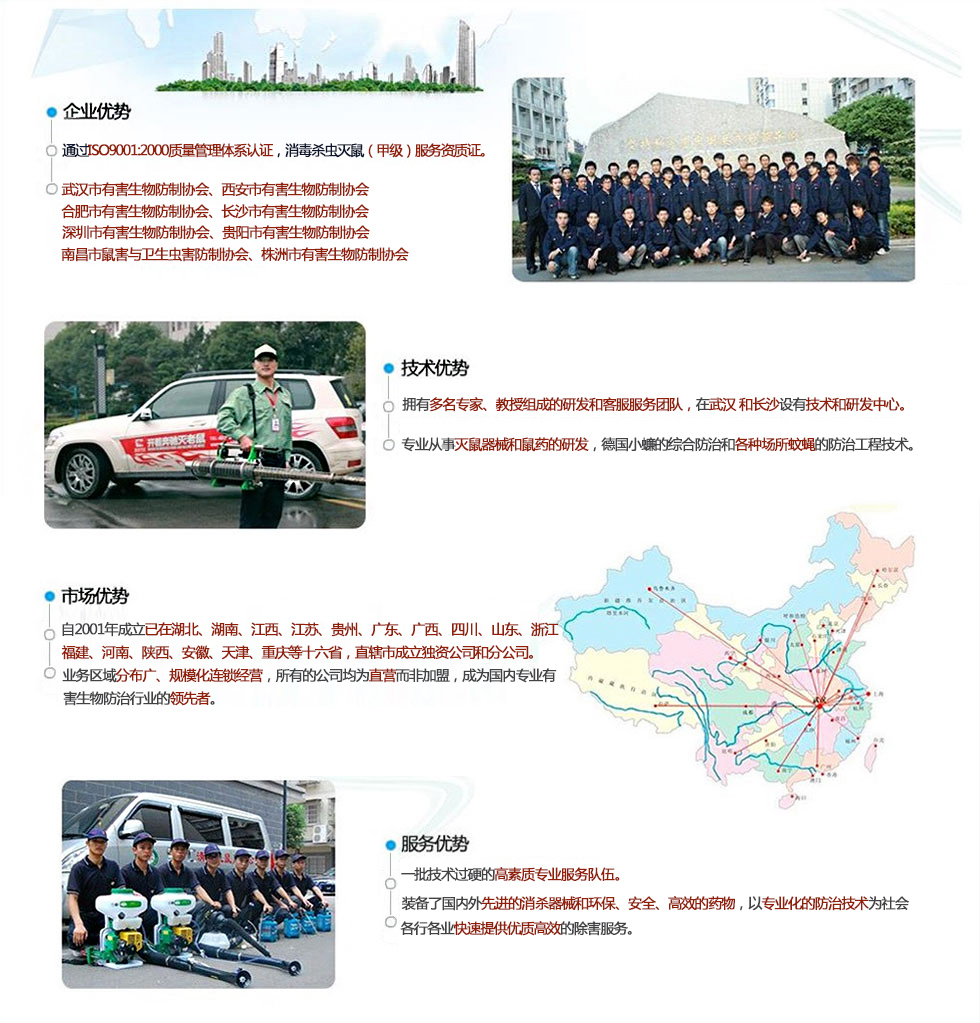 我們堅(jiān)持“誠信、高效、安全、環(huán)保”的服務(wù)宗旨,所用器械均為世界優(yōu)質(zhì)產(chǎn)品,所用藥物均系國家藥檢部門和衛(wèi)生防疫部門批準(zhǔn)的安全、低毒的城市衛(wèi)生用藥,并根據(jù)具體作業(yè)環(huán)境和防治對象情況變化,制定具體防制方案,保證優(yōu)越的防治效果和人體安全。